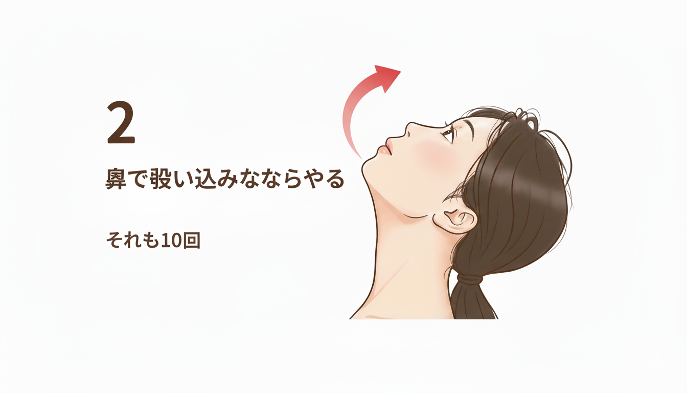 また、鼻呼吸を意識して首筋の筋肉を働かせると、さらにリフトアップ効果が高まり、ほうれい線の改善にも役立つそうです。