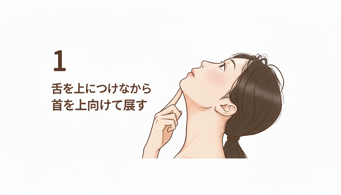 - 舌を上あごにつけたまま、首を上に向けてから戻します。
