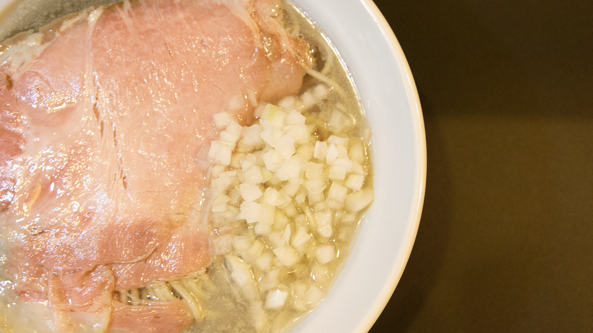 シンプルな具材で、低温調理した豚肩ロースのチャーシューと刻み玉ねぎだけを使い、スープの味わいを引き立てています。コシのある中細麺がスープによく絡み、煮干しの旨味を存分に楽しめます。