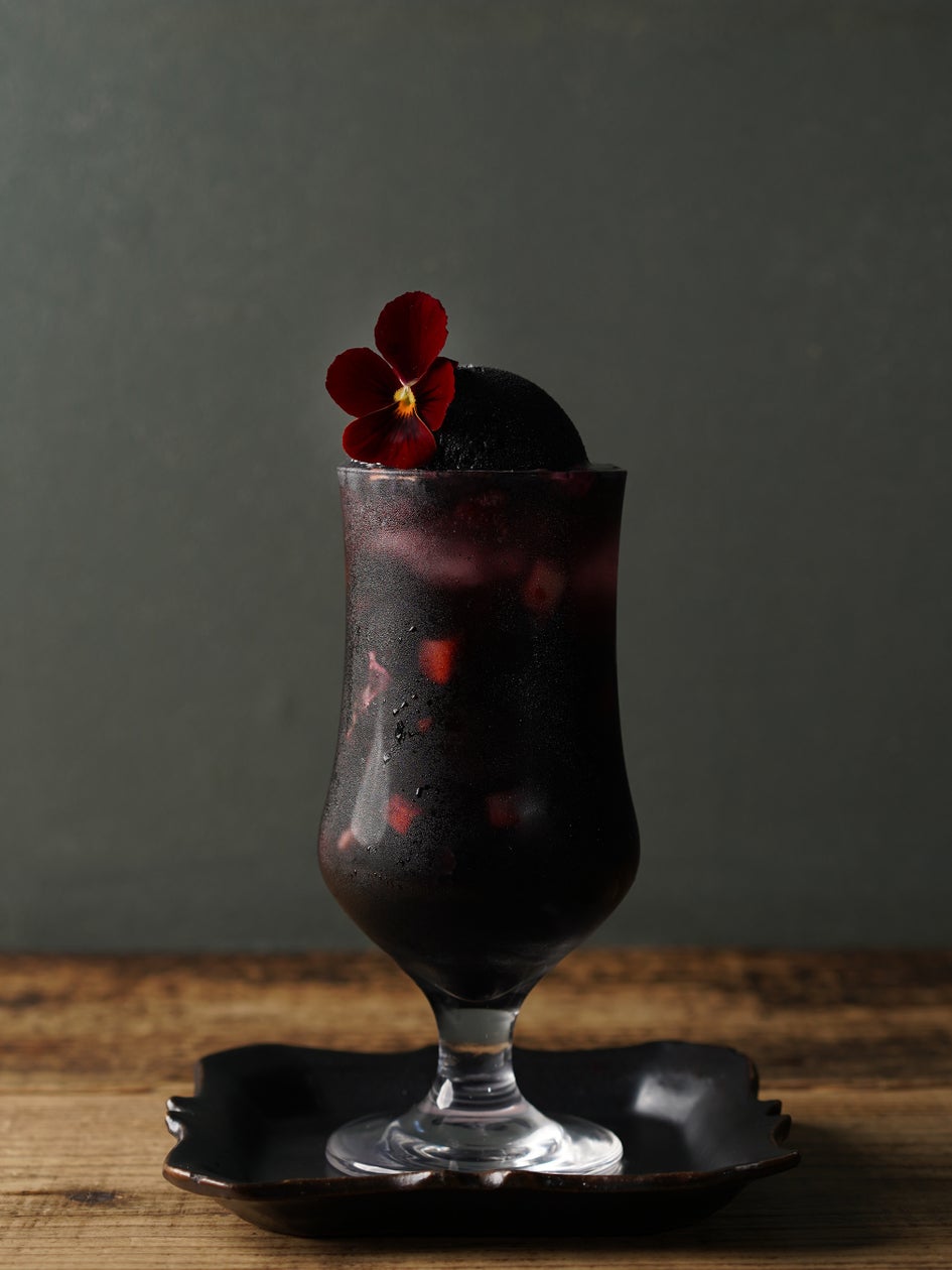 ベースは甘酸っぱいベリーのソーダに、上品に香るローズを合わせています。トッピングには、デンマーク産の泥炭(ピート)をはじめとする天然の色素で色付けした漆黒のバニラアイスを贅沢にのせました。黒に映える色鮮やかなビオラの花びらと、アクセントのピンクペッパーが目を引きます。